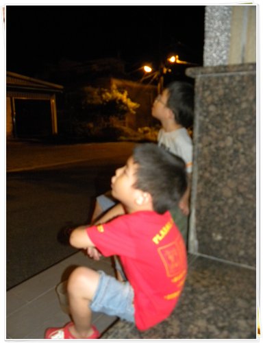 晚餐後進廚房刷洗,出來後客廳空無一人,聽到門外聲響,探頭出去一瞧,發現一個在石椅上、一個倚著柱子,兩兄弟角度一致的望著天空。
